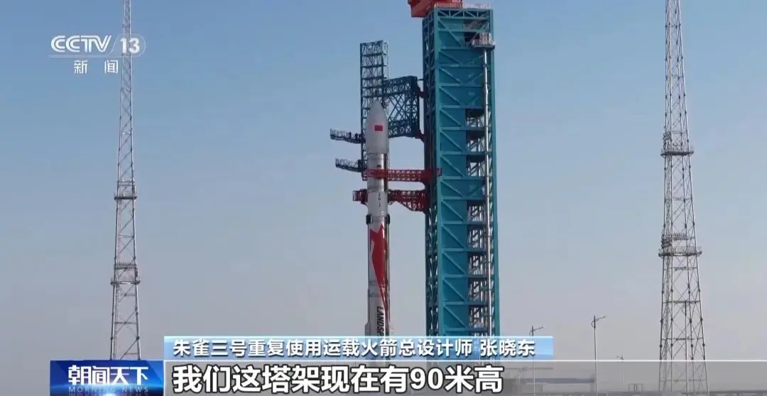总台央视记者 崔霞:朱雀三号高度有66米、直径是4.5米,整个箭体采用的是不锈钢这个材料,它也是目前我们国家第一型可重复使用的运载火箭。